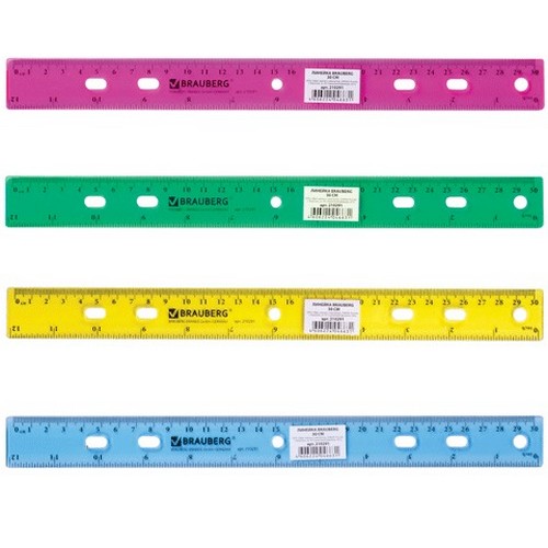 Прозрачная линейка из прочного тонированного пластика. Имеет безопасные закруглённые углы. Длина шкалы составляет 30 см. Линейка обладает четкой разметкой, что делает ее удобной в использовании. Имеет двойную градацию шкалы (сантиметр, дюйм). Поставляется в нескольких вариантах цвета (без возможности выбора). Упакована в пластиковый пакет с европодвесом.