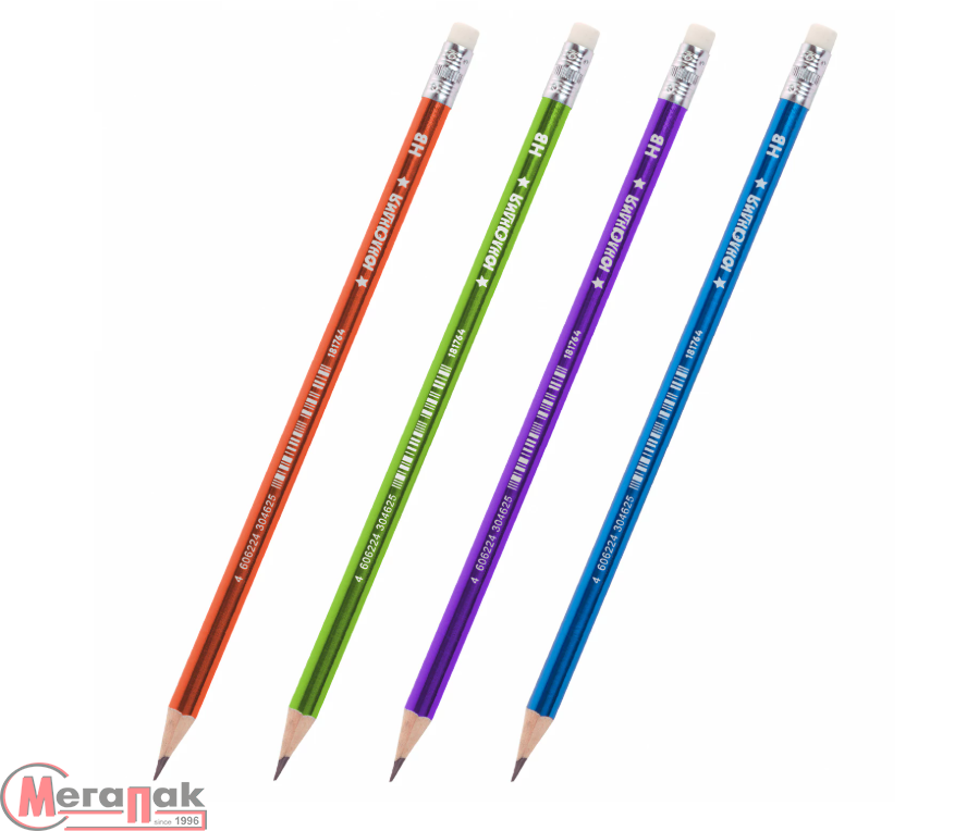 Каждый карандаш имеет индивидуальный штрих-код. Легко затачивается, максимально устойчив к повреждениям. Изготовлен из дерева высокого качества. Имеет круглый корпус с яркой металлизированной печатью ассорти, оснащен ластиком. Карандаш длиной 190 мм обладает средней степенью твердости – HB.
