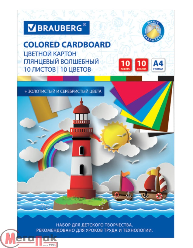 Картон цветной А4 МЕЛОВАННЫЙ ВОЛШЕБНЫЙ 10 л.,10 цветов, в папке,BRAUBERG, 200х290мм, Маяк, 129915