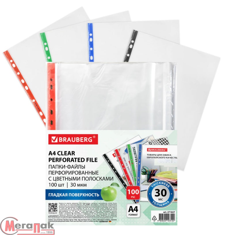 Перфорированные папки-файлы BRAUBERG с цветными полосками предназначены для хранения документов в папке с любым кольцевым механизмом или скоросшивателем.
