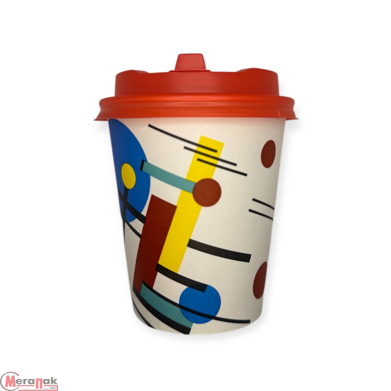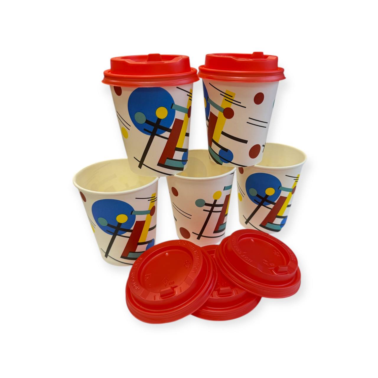 Комплект: Стакан бумажный 250мл для горячего Абстракция 1+ Крышка D80, красная открывающийся питейник, 5шт