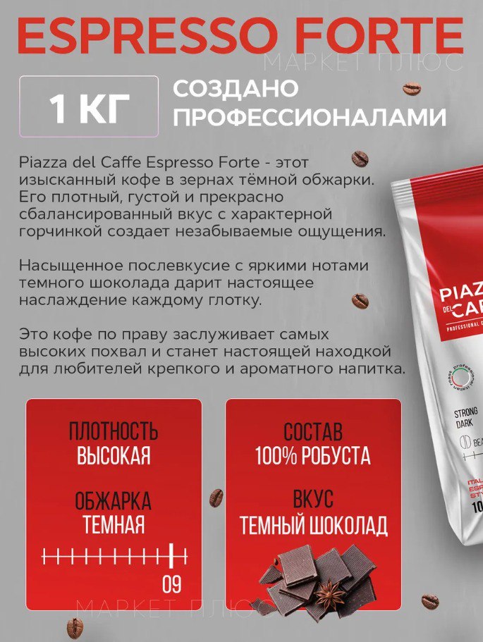 Piazza del Caffe Espresso Forte – это роскошный кофе в зернах, созданный для самых взыскательных гурманов. Обладая плотным, густым и прекрасно сбалансированным вкусом с характерной горчинкой, этот кофе не оставит равнодушным никого. Тёмная обжарка придаёт зернам насыщенные ноты темного шоколада, которые дарят истинное наслаждение каждому глотку. Этот кофе состоит исключительно из 100% робусты, что делает его идеальным выбором для любителей крепких и ароматных напитков, которые ищут насыщенный и незабываемый вкус.