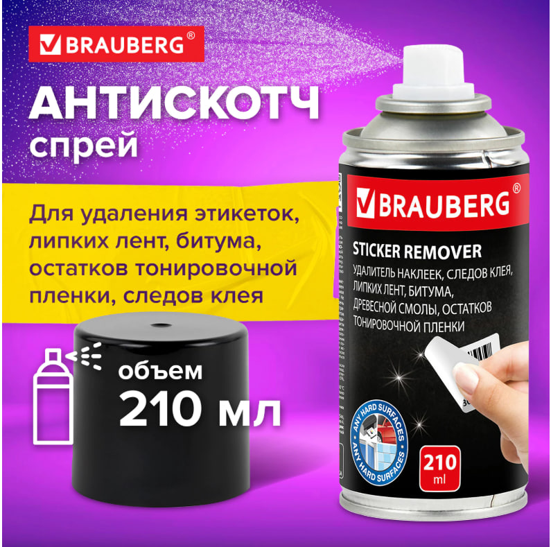 Средство BRAUBERG предназначено для быстрого и эффективного удаления остатков клея, клейкой ленты, тонировочной пленки, битума, информационных наклеек и рекламы.