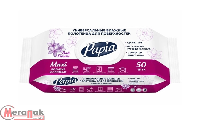 Влажные полотенца для очищения поверхностей универсальные, Papia- это удобное решение для уборки. Большие и прочные полотенца отлично удалят жир, не оставляя разводов. С эффектом антистатика. Подходят для уборки кухни и ванной, очистки окон, зеркал, мебели, а также салона и кузова автомобиля.
