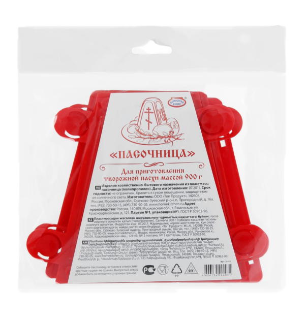 Используется для приготовления пасхи из творожной массы. Набор упакован в пластиковый пакет с картонным клипсатором.
