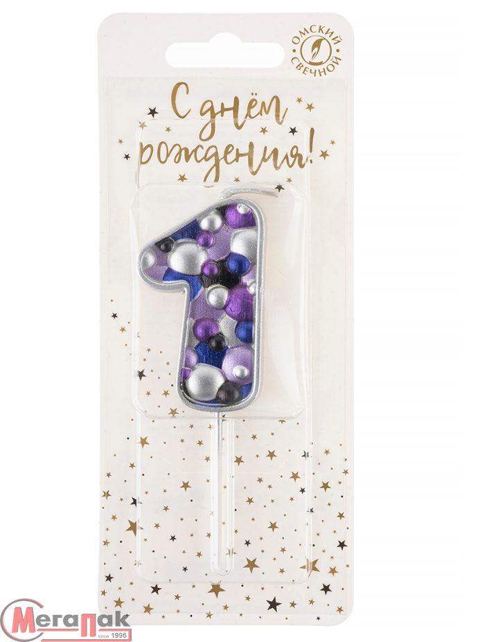 Свеча Цифра, 1 Пузырьки, на шпажке, Сиреневый, Металлик, 4*5,5 + 4 см, 1 шт. с держат., арт. 5581