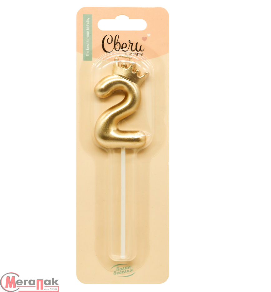 Свеча Цифра, 2 Корона, на шпажке, Золото, Металлик, 3,5*5,5 + 6,5 см, 1 шт. с держат., арт 803072