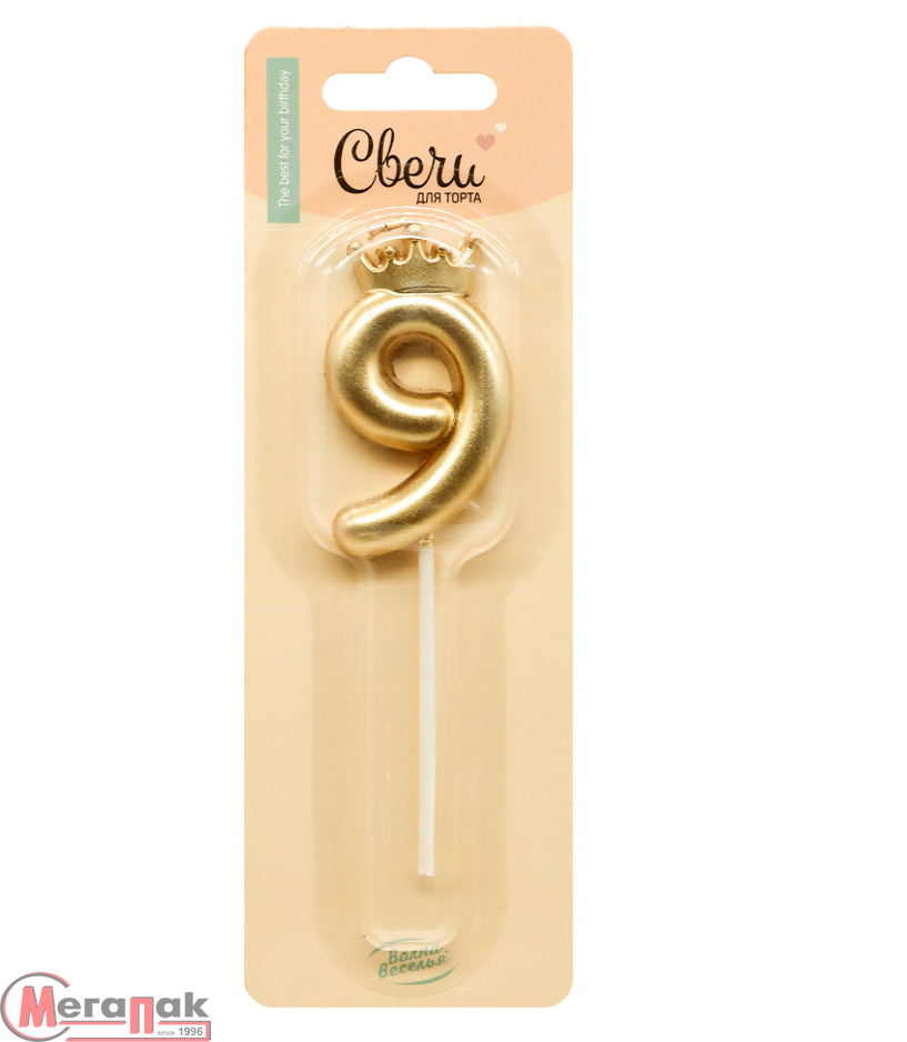 Свеча Цифра, 9 Корона, на шпажке, Золото, Металлик, 3,5*5,5 + 6,5 см, 1 шт. с держат., арт 803079