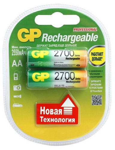 В комплекте 2 никель-металл-гидридных батарейки GP 270AAHC, каждая обладает емкостью 2700 мАч и напряжением 1.2 вольта. Батарейки способны перезаряжаться более 500 раз за все время эксплуатации и работать даже при –20 °C.
