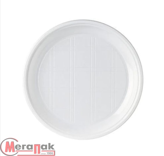 Тарелка диаметром 220 мм, изготовлена из полипропилена. Устойчива к воде и жиру. Безопасна для горячих продуктов и разогрева в СВЧ. Не рекомендуется мыть, а также использовать повторно. Широко применяется в сфере фаст-фуд, является необходимым атрибутом для проведения корпоративных мероприятий, праздников и пикников.