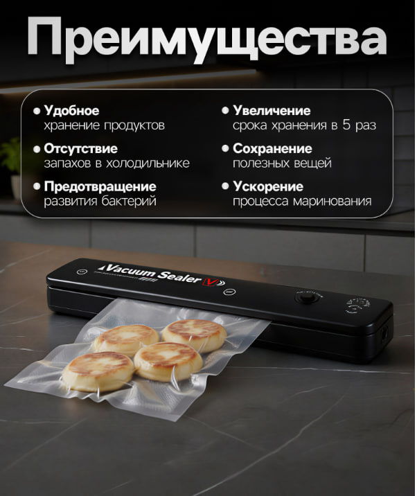 Этот вакууматор станет надёжным помощником в сохранении вкуса и качества продуктов, позволяя экономить пространство и уменьшать количество пищевых отходов. Его простота и эффективность делают процесс упаковки быстрым и комфортным для каждого пользователя.