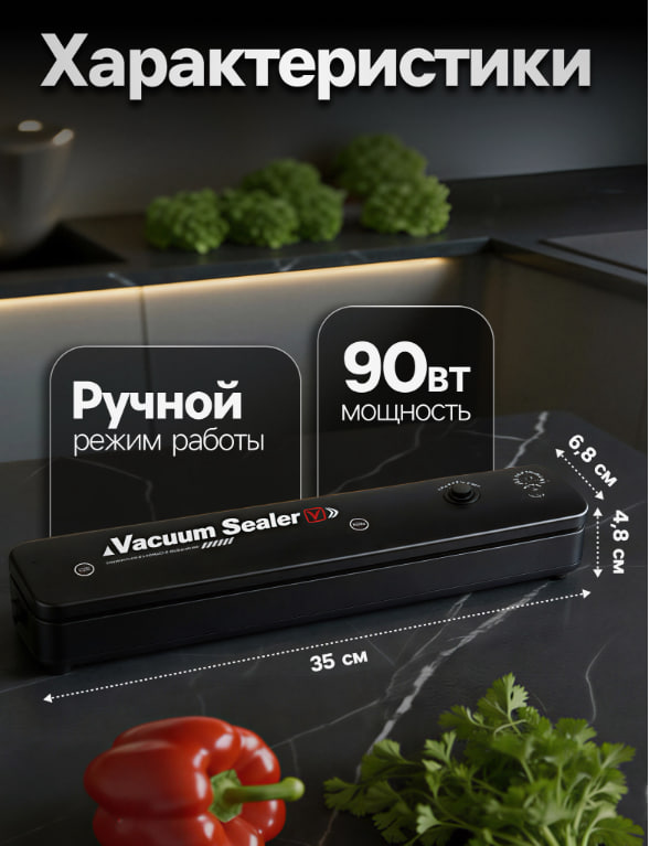 Компактный вакууматор с мощностью 90 Вт и длиной запаивания 35 см отлично справляется с задачей сохранения свежести продуктов и увеличения срока их хранения. Его чёрный корпус выглядит стильно и современно, а ручной режим вакуумирования даёт полный контроль над процессом упаковки, позволяя адаптироваться под разные типы продуктов.