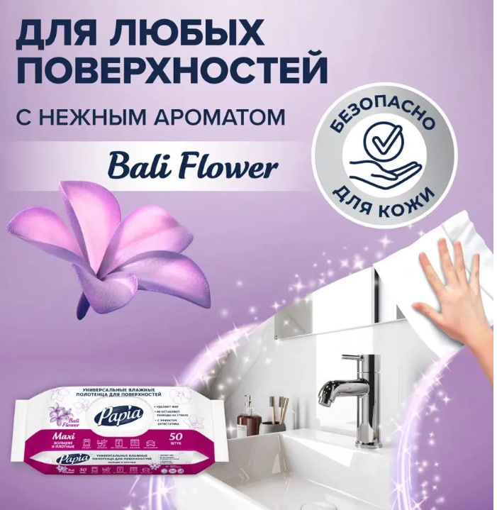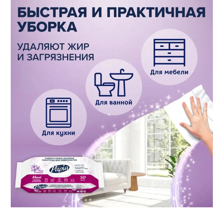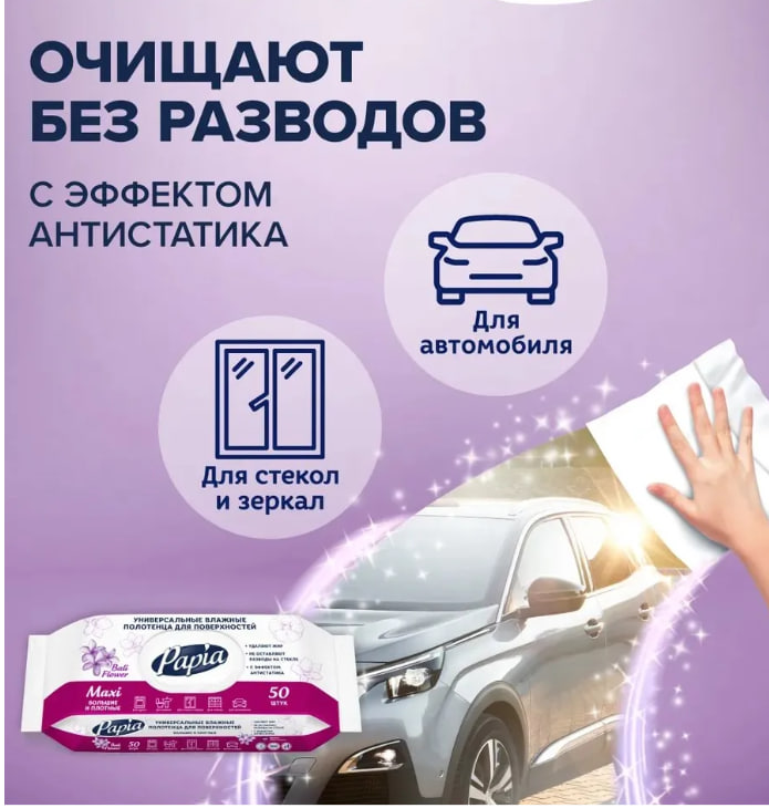 Влажные полотенца для очищения поверхностей универсальные, Papia- это удобное решение для уборки. Большие и прочные полотенца отлично удалят жир, не оставляя разводов. С эффектом антистатика. Подходят для уборки кухни и ванной, очистки окон, зеркал, мебели, а также салона и кузова автомобиля.